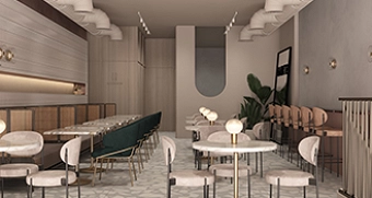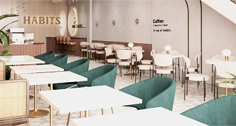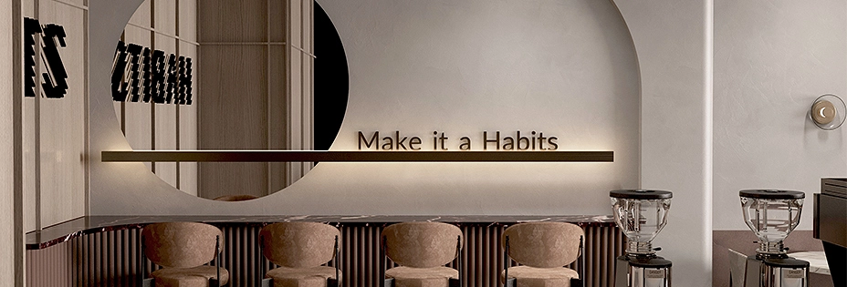 Habits café features a modern design that embraces contemporary style, using a carefully selected range of materials. The floors are adorned with unique terrazzo patterns, adding a special aesthetic touch, while the distinctive burgundy marble used at the bar stands out as a focal point, reflecting luxury and refined taste.The wood colors used in the furniture harmonize with the other design elements, creating a warm and inviting atmosphere for visitors. Color tones have been carefully chosen to provide a comfortable environment that enhances the customer experience, allowing them to enjoy their time with friends and family.