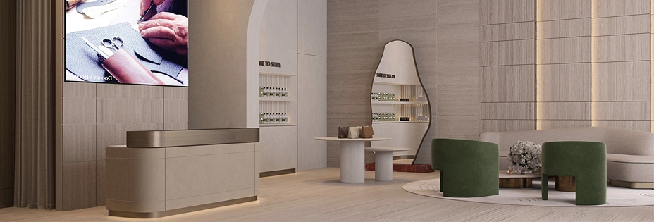 The design of the leather repair shop features a comfortable and attractive atmosphere that combines modern luxury with meticulous attention to detail. Colors and materials have been carefully chosen to provide a comprehensive experience for visitors, making the area look practical and visually appealing. The design elements include the use of comfortable and functional furniture, complemented by elegant touches that reflect the quality of the services offered. Warm lighting has been integrated to highlight the products and services, adding a touch of sophistication and making customers feel welcomed.